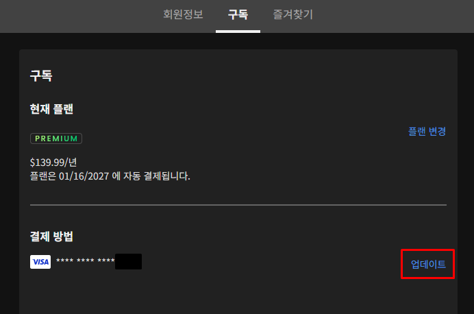 3. 결제 방법 오른쪽에 있는 [업데이트] 클릭.